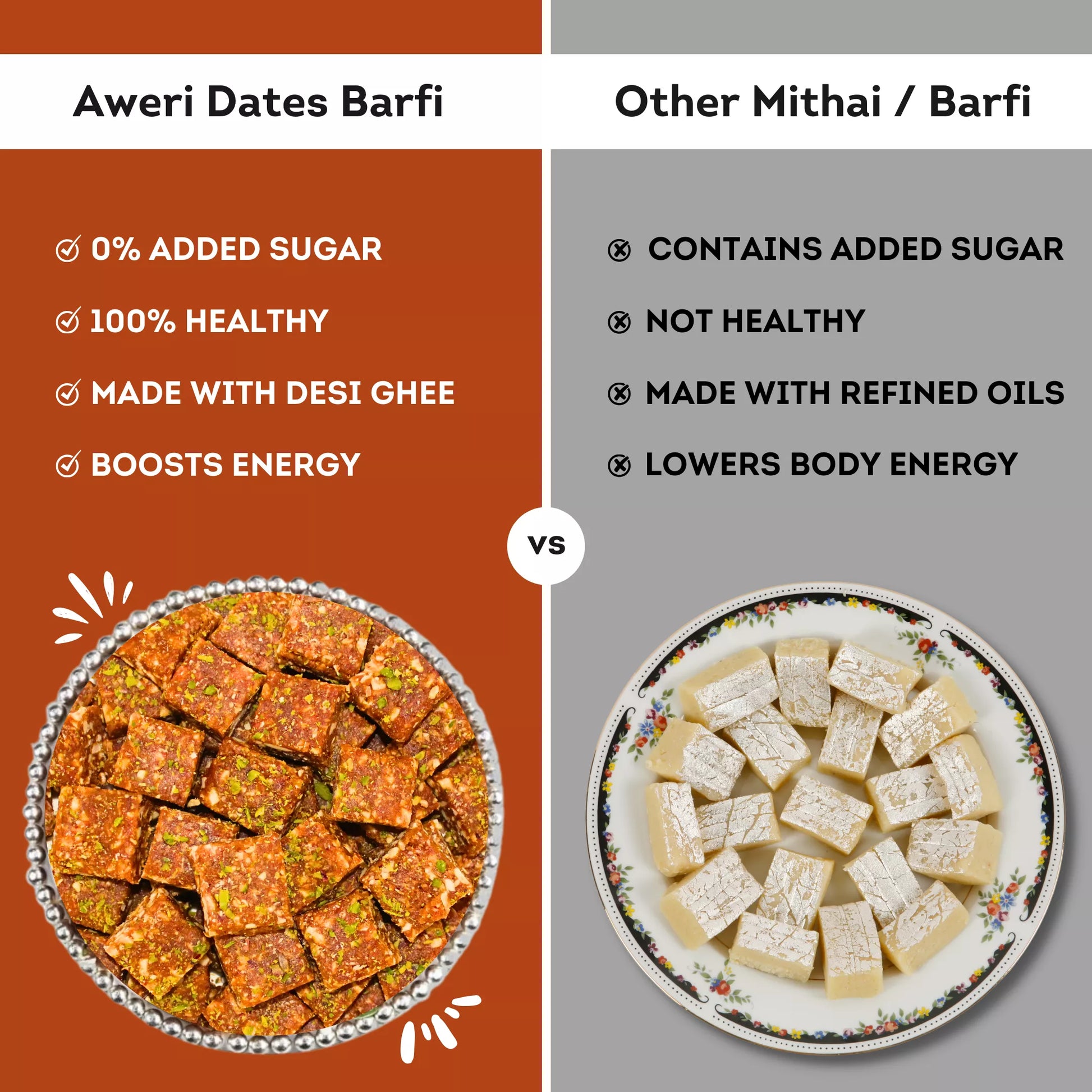 Aweri’s Dates Barfi has no added sugar, no preservatives and no false claims. We’ve made it with a lot of love in pure ghee and you’ll feel that in every bite. Now you can indulge in peace!