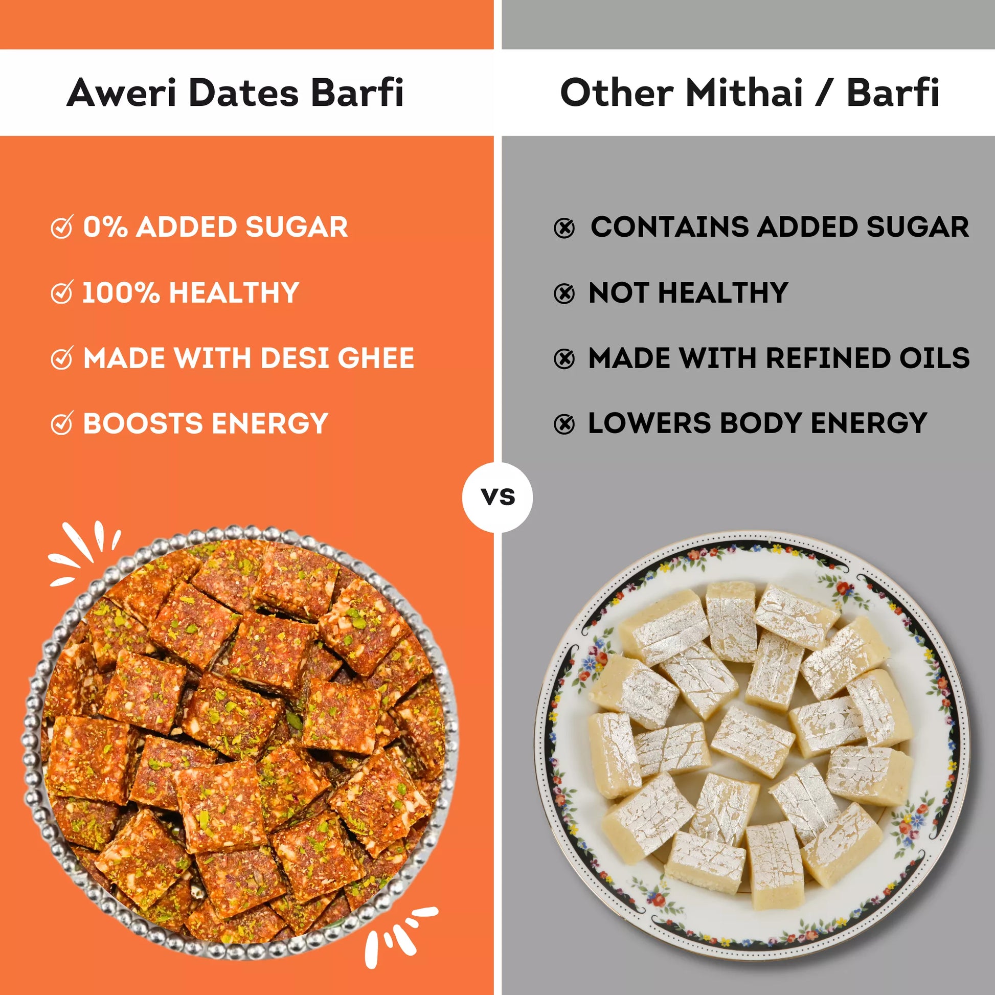 Aweri’s Dates Barfi has no added sugar, no preservatives and no false claims. We’ve made it with a lot of love in pure ghee and you’ll feel that in every bite. Now you can indulge in peace!
