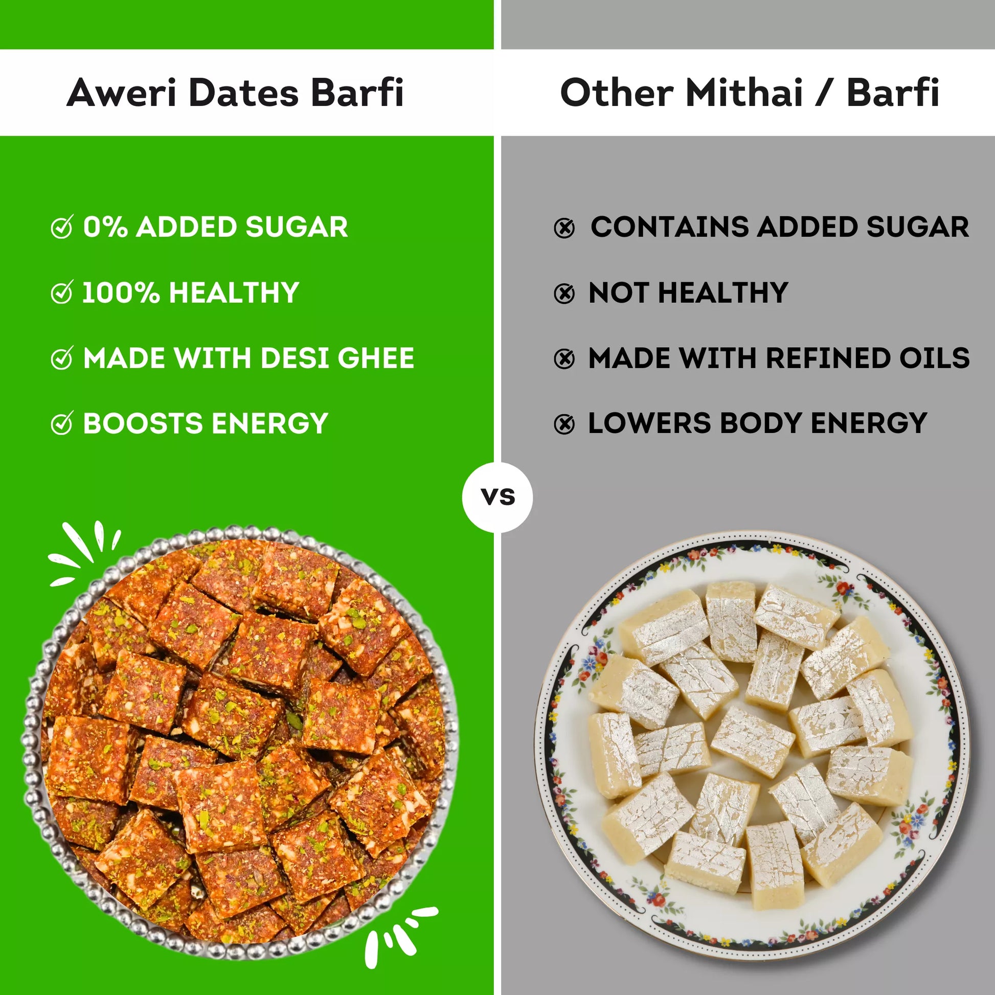 Aweri’s Dates Barfi has no added sugar, no preservatives and no false claims. We’ve made it with a lot of love in pure ghee and you’ll feel that in every bite. Now you can indulge in peace!