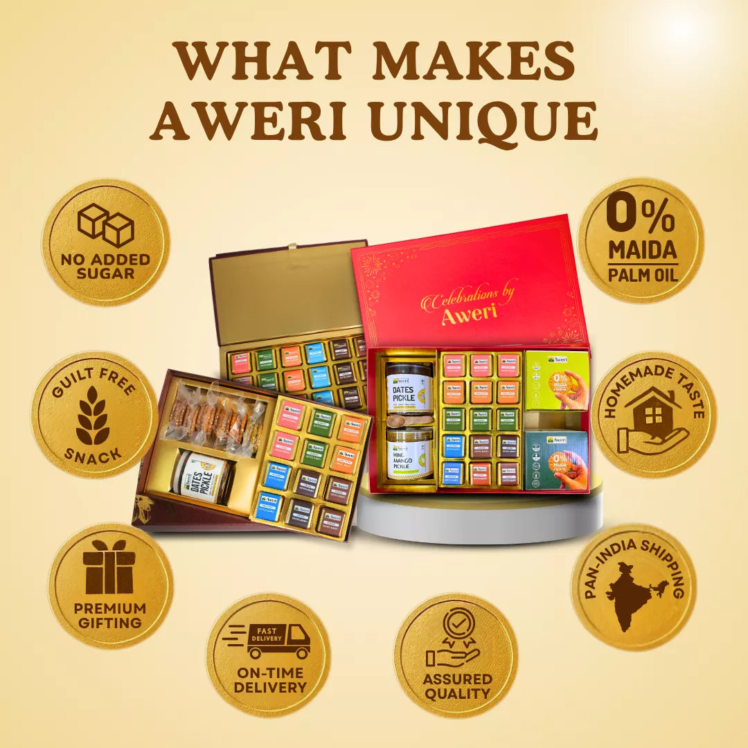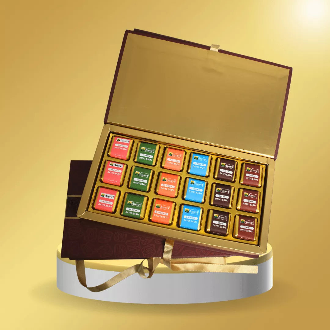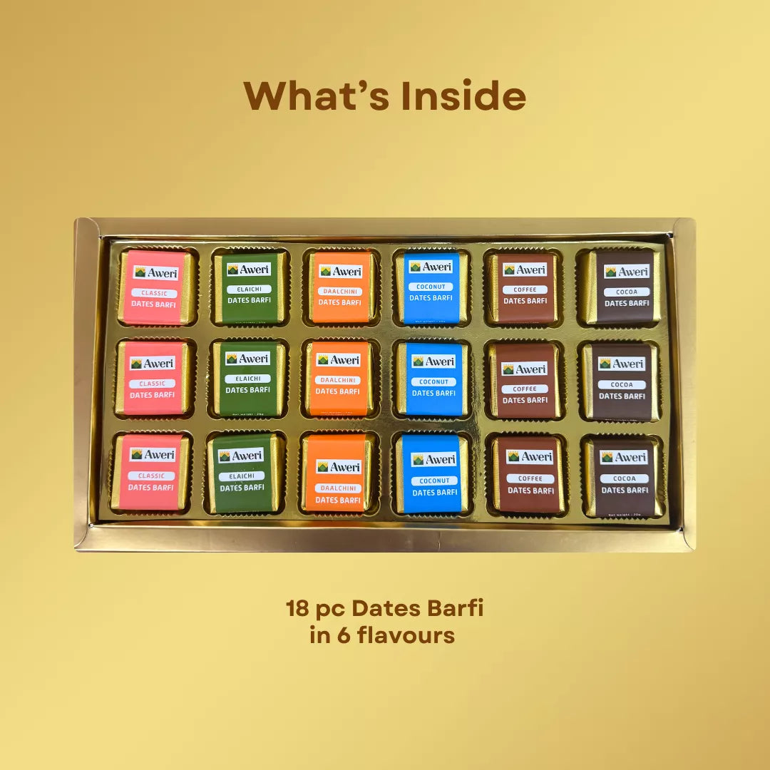 Inside, you’ll find 18 pieces of our rich, no-added-sugar *Dates Barfi*, beautifully packaged and sealed with an elegant ribbon. Whether it's for a sweet gesture or a small celebration, this box offers a delightful treat wrapped in charm.